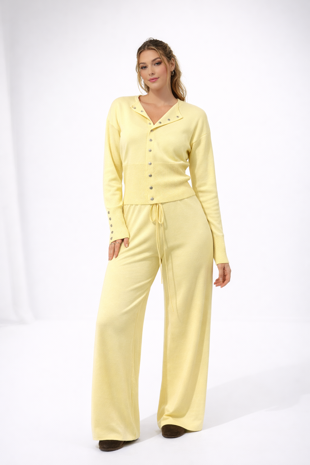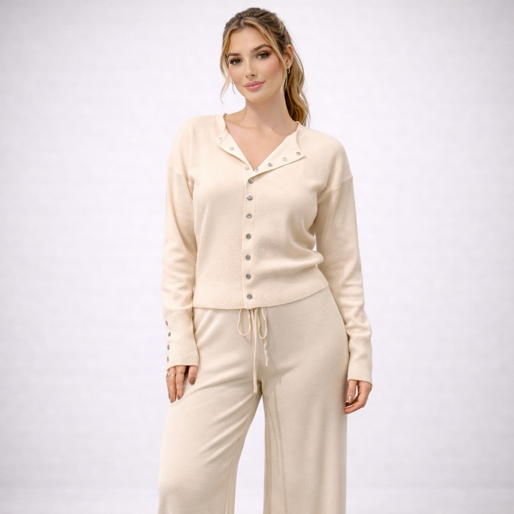 Eleganter Feinstrick-Zweiteiler mit Knopfleiste und bequemer Hose.